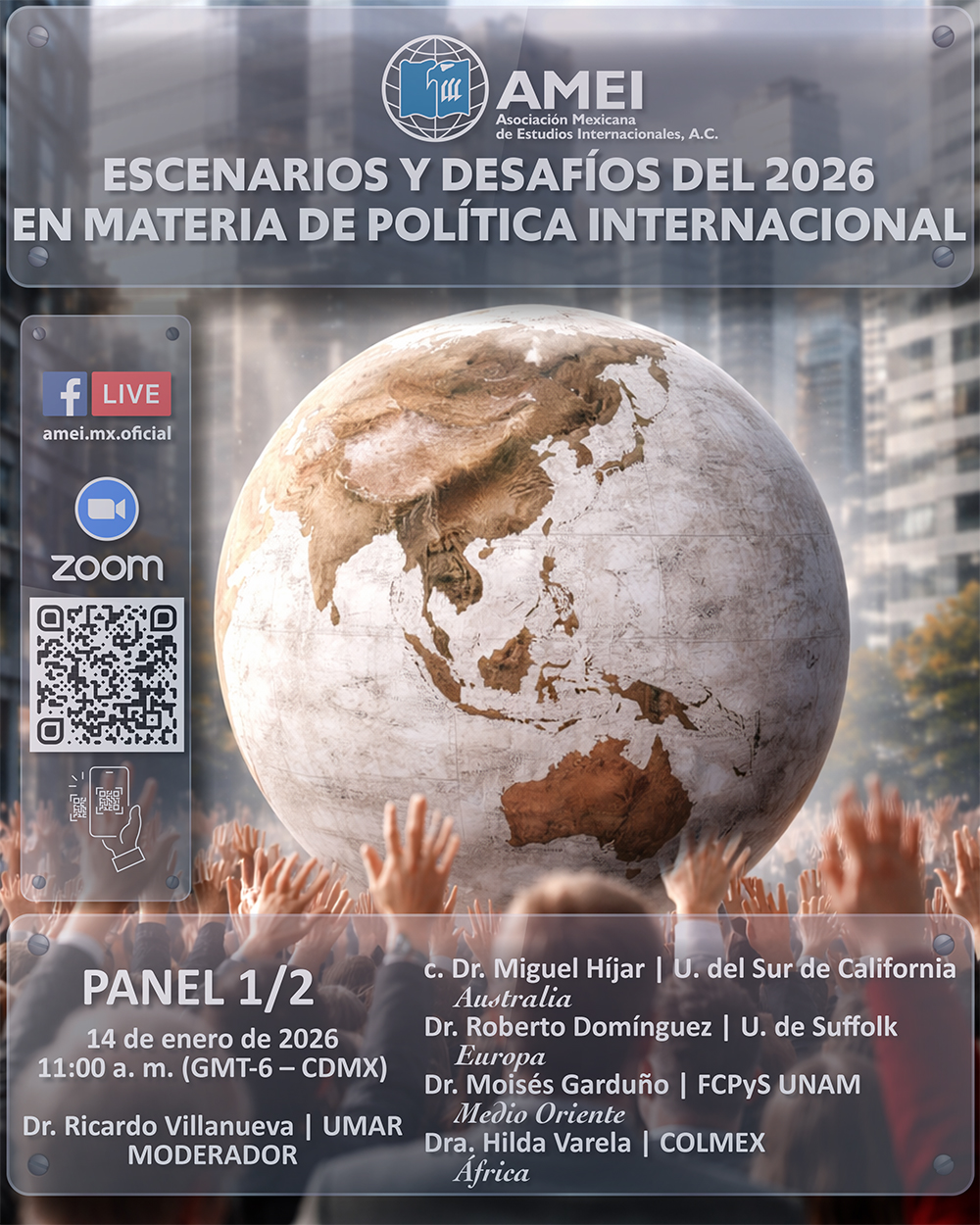 El Comité Académico de Política Internacional de la Asociación Mexicana de Estudios Internacionales (AMEI) invita a la comunidad académica y público en general a unirse virtualmente al panel titulado “Escenarios y desafíos del 2026 en materia de Política Internacional”. Este espacio de reflexión académica tiene como finalidad analizar, desde diversas perspectivas regionales, los principales escenarios y retos que la sociedad internacional podría enfrentar en el ámbito de la política internacional de cara al año 2026.