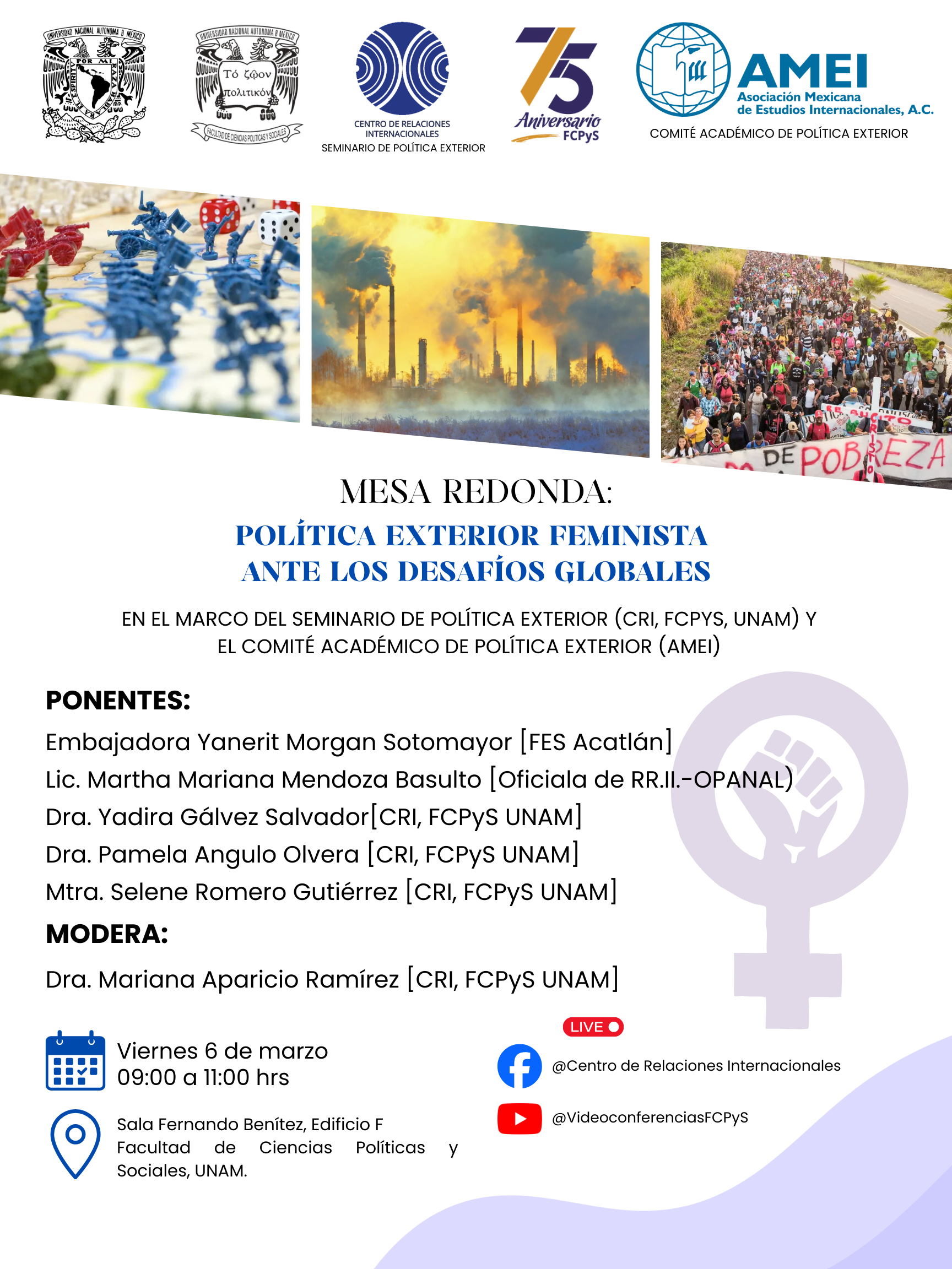 ✨📣 Invitamos a la comunidad AMEI a asistir a la mesa redonda “𝑷𝒐𝒍𝒊𝒕𝒊𝒄𝒂 𝒆𝒙𝒕𝒆𝒓𝒊𝒐𝒓 𝒇𝒆𝒎𝒊𝒏𝒊𝒔𝒕𝒂 𝒂𝒏𝒕𝒆 𝒍𝒐𝒔 𝒅𝒆𝒔𝒂𝒇𝒊𝒐𝒔 𝒈𝒍𝒐𝒃𝒂𝒍𝒆𝒔” que organizan de manera conjunta el Centro de Relaciones Internacionales de la Facultad de Ciencias Políticas y Sociales – UNAM y el comité académico de Política Exterior de la AMEI.